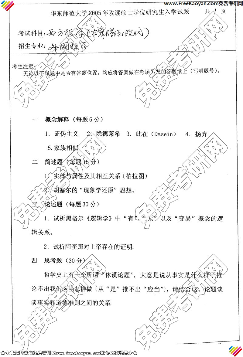 华东师范大学2005年考研真题-西方哲学(古希腊至现在)