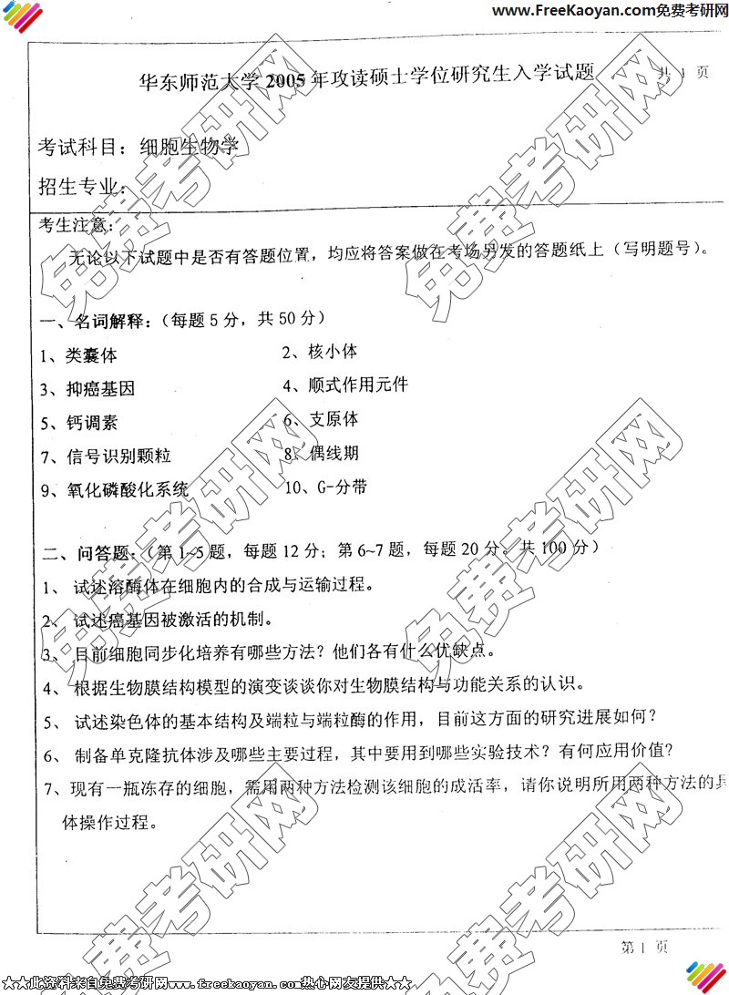 专业课考研经验 本站小编 FreeKaoyan 2018-01-22华东师范大学2005年考研真题-物理化学