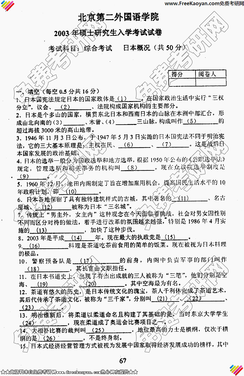 北京第二外国语学院2003年考研真题-综合考试(日本概况部分)
