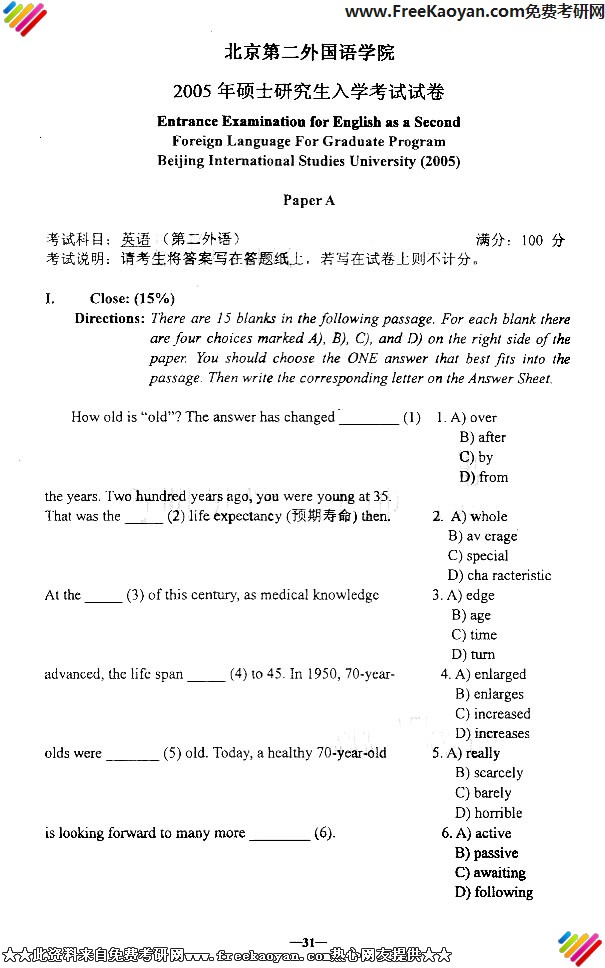 专业课考研经验 本站小编 FreeKaoyan 2018-01-22(北京第二外国语学院2004研)I. GRAMMARDirections: In this section, there are 13 sentences each with one word or phrase missing. Choose one of the four choices mar ...