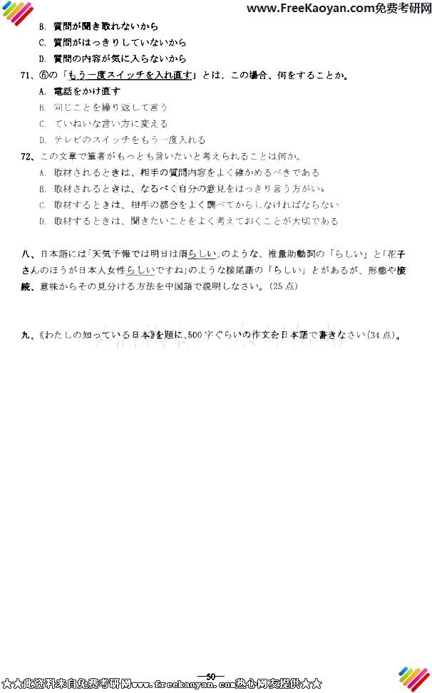 专业课考研经验 本站小编 FreeKaoyan 2018-01-22一、填空(10分)1.奈良时代〈记纪歌谣〉的“记纪”指的是( )和( )。2.日本最早的汉诗集是( )。3.〈竹取物语〉〈源氏物语〉〈大镜〉〈徒然草〉〈雨月物语〉,这五篇中最早的作品是( )。4.( )是由北村透谷、岛崎藤村等于明治26年创刊的文学杂志。5.明治时代中期初称为“红露”的作家是( )和 ...