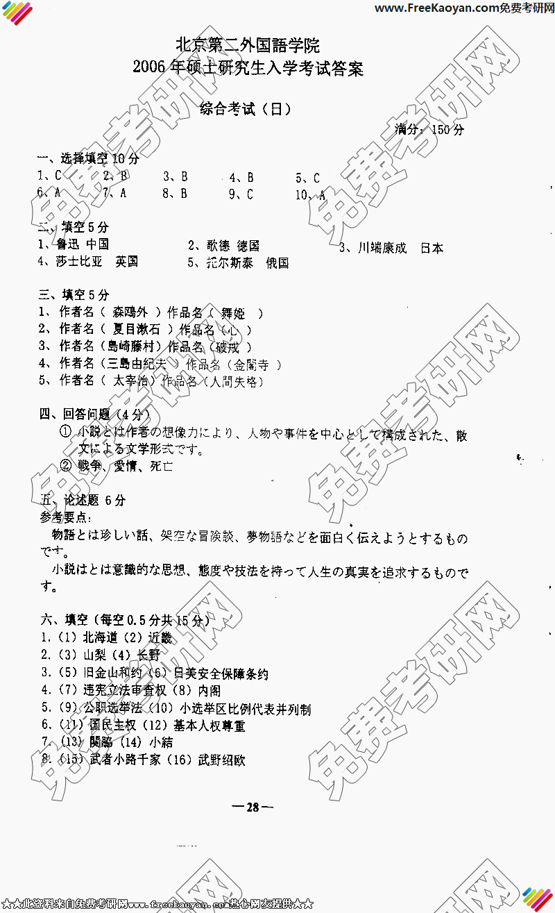 北京第二外国语学院2006年考研真题-综合考试(日语)试题答案