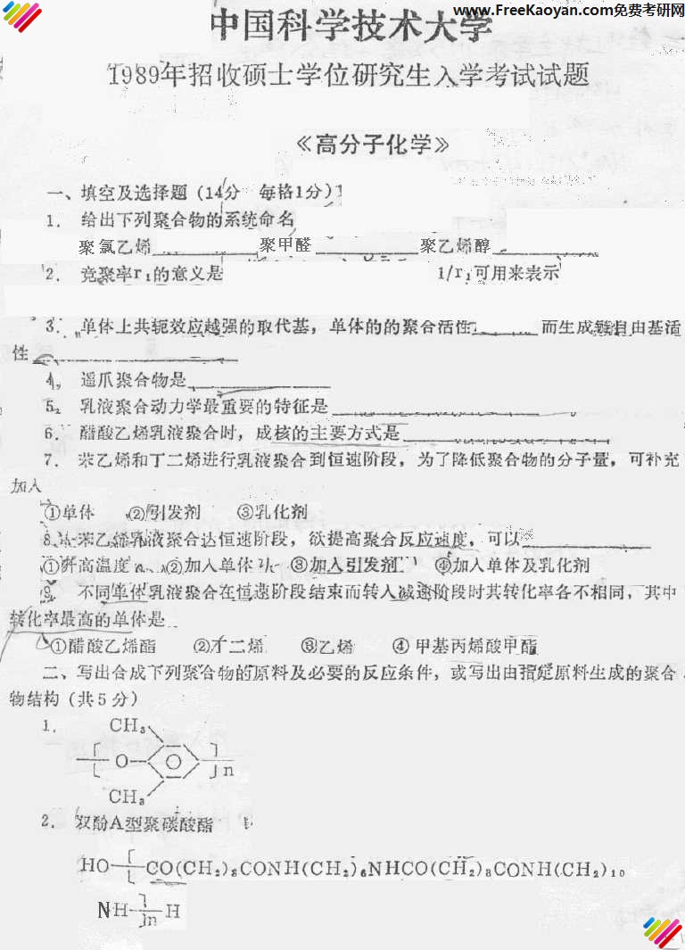 相关话题/中国科学技术大学 考研真题 高分子化学