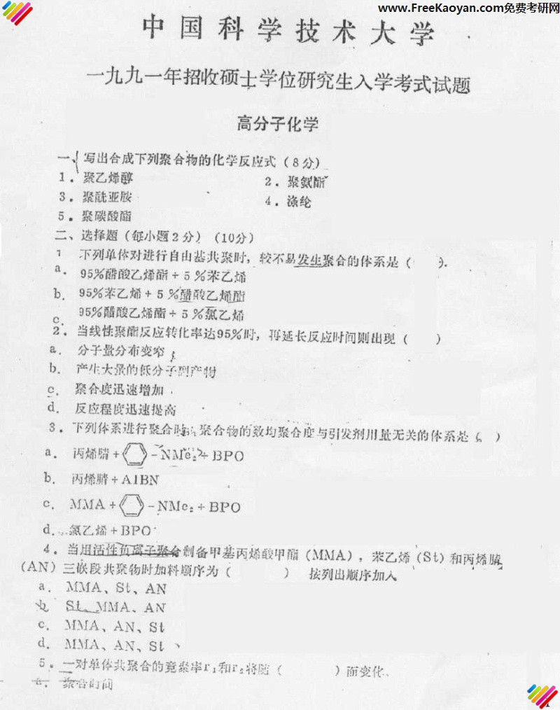 相关话题/中国科学技术大学 考研真题 高分子化学