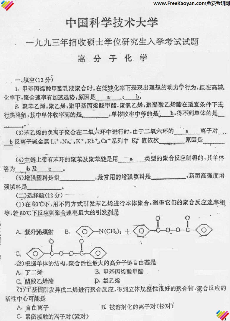 中国科学技术大学1993年考研真题-高分子化学