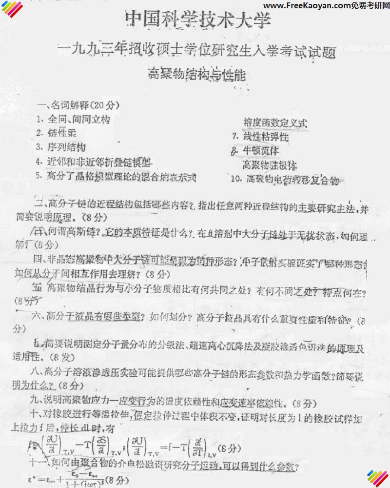 专业课考研经验 本站小编 FreeKaoyan 2018-01-22中国科学技术大学1993年考研真题-高分子化学