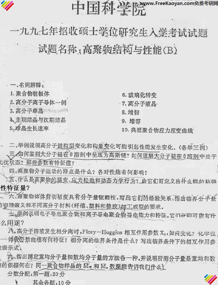 专业课考研经验 本站小编 FreeKaoyan 2018-01-22中国科学技术大学1997年考研真题-高分子化学