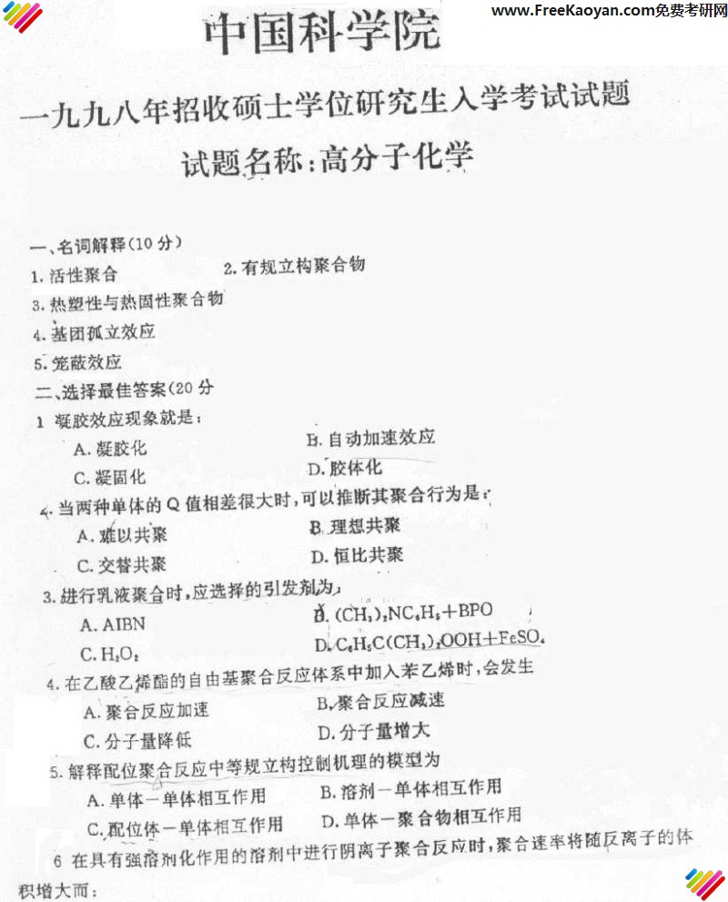 中国科学技术大学1998年考研真题-高分子化学
