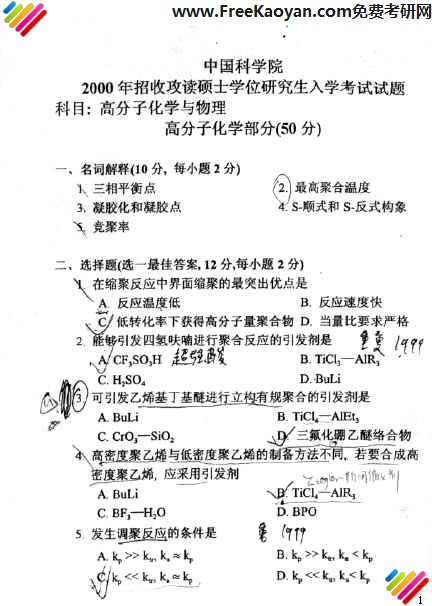 中国科学技术大学2000年考研真题-高分子化学与物理
