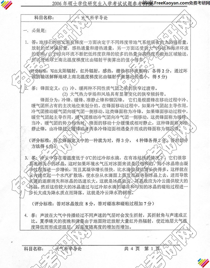 中国科学技术大学2006年考研真题-大气科学导论答案