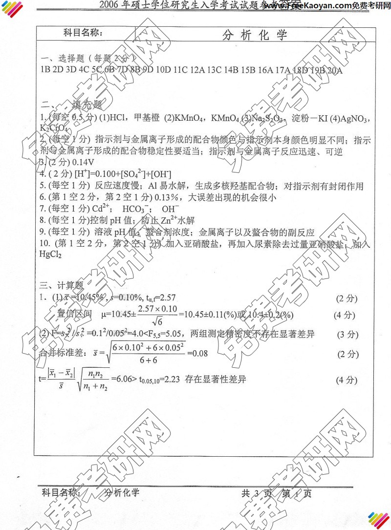 专业课考研经验 本站小编 FreeKaoyan 2018-01-22中国科学技术大学2006年考研真题-分析化学