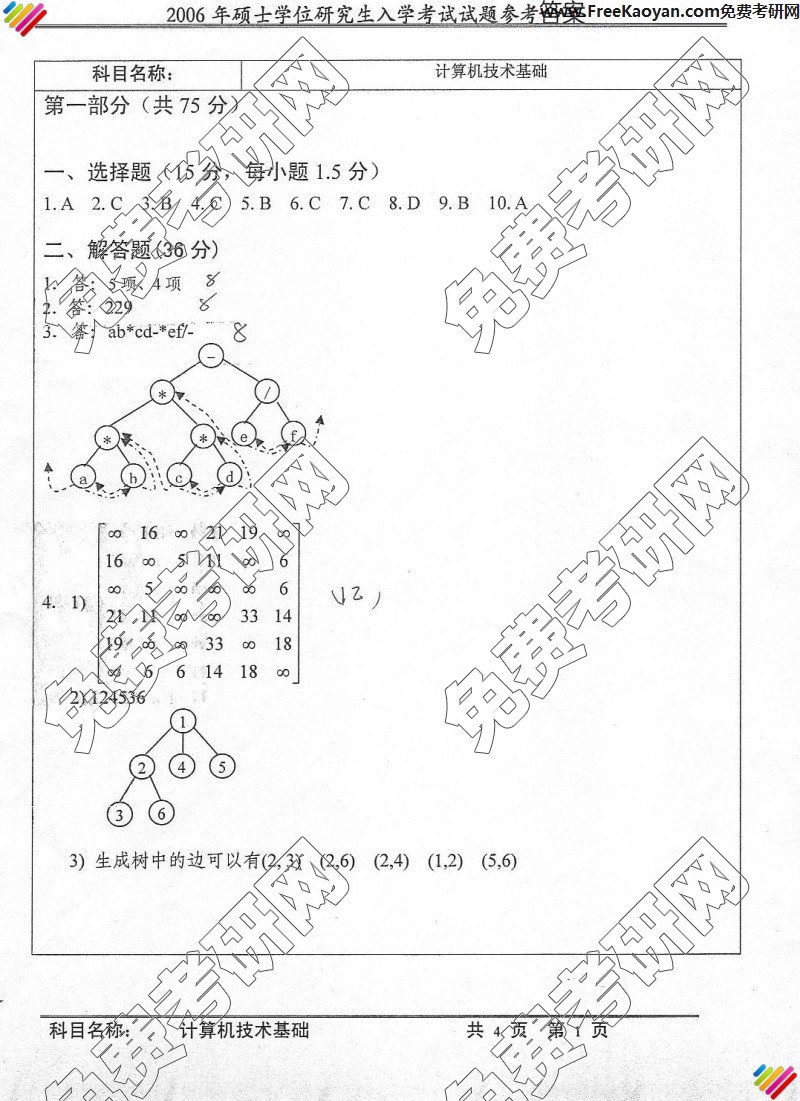 中国科学技术大学2006年考研真题-计算机技术基础答案