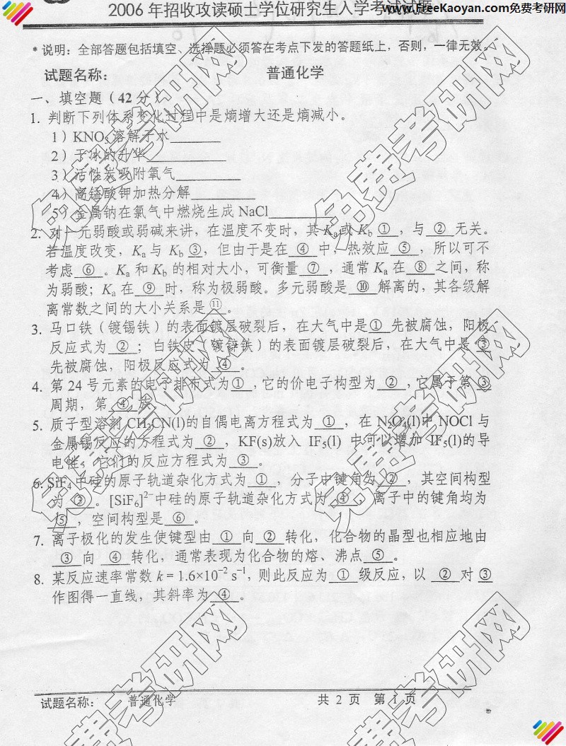中国科学技术大学2006年考研真题-普通化学