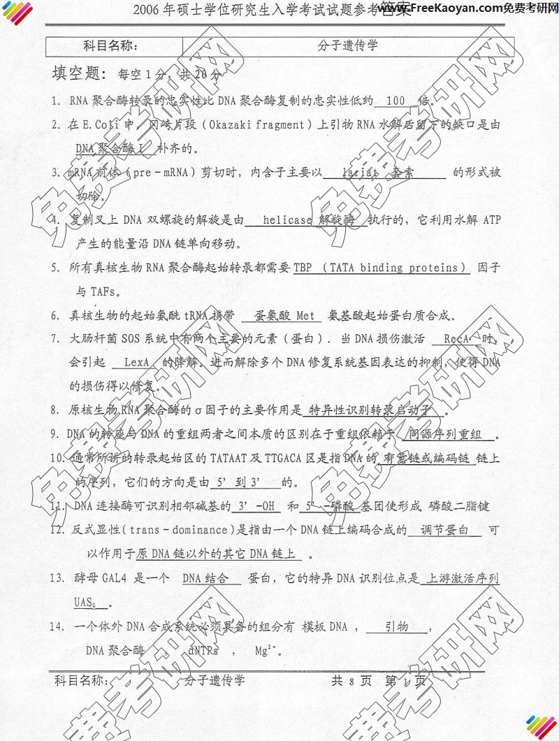 专业课考研经验 本站小编 FreeKaoyan 2018-01-22中国科学技术大学2006年考研真题-生物化学答案