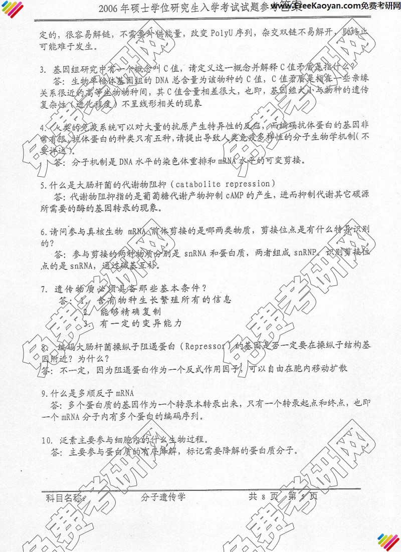 专业课考研经验 本站小编 FreeKaoyan 2018-01-22中国科学技术大学2006年考研真题-生物化学答案
