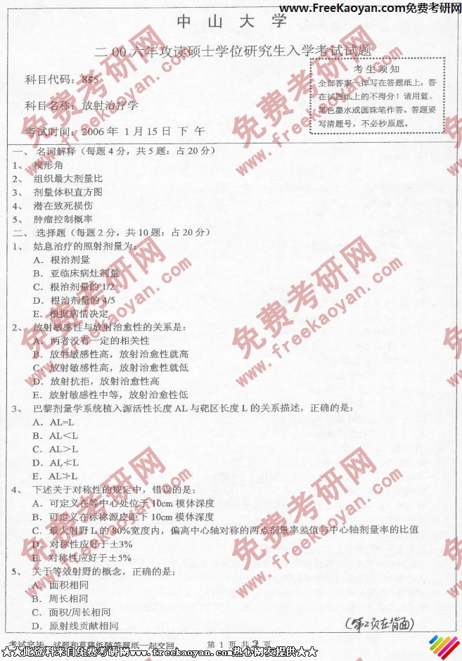 中山大学2006年考研真题-放射治疗学
