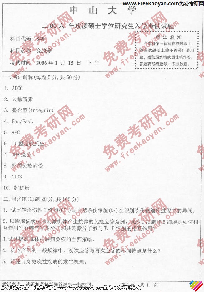 专业课考研经验 本站小编 FreeKaoyan 2018-01-22中山大学2006年考研真题-病理学