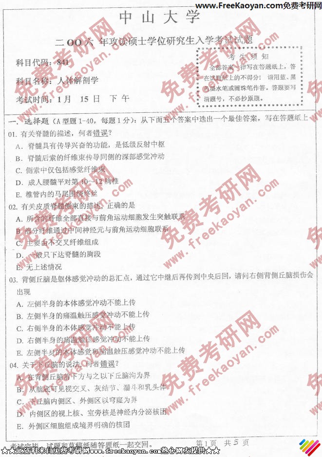 专业课考研经验 本站小编 FreeKaoyan 2018-01-22中山大学2006年考研真题-病理学
