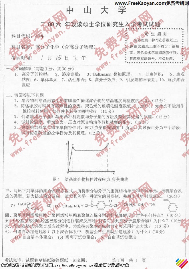 中山大学2006年考研真题-高分子化学(含高分子物理)