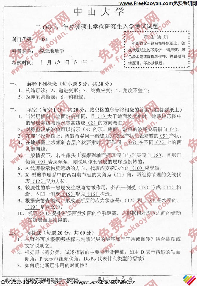 专业课考研经验 本站小编 FreeKaoyan 2018-01-22中山大学2006年考研真题-地下水资源与环境