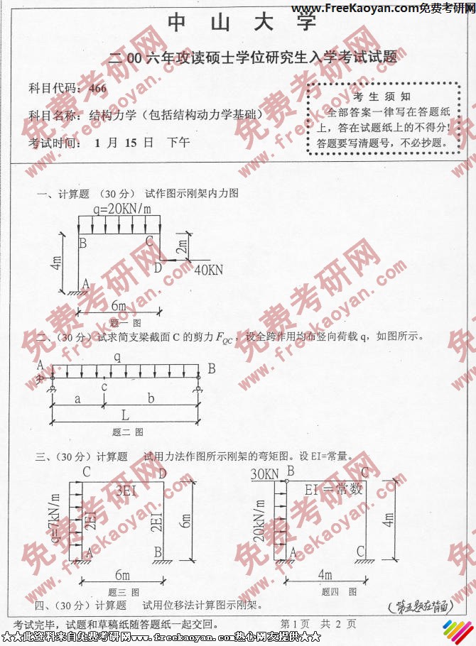中山大学2006年考研真题-结构力学(包括结构动力学基础)