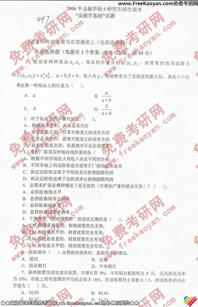 中山大学2006年考研真题-金融学基础(含经济学原理和金融学原理两部分)