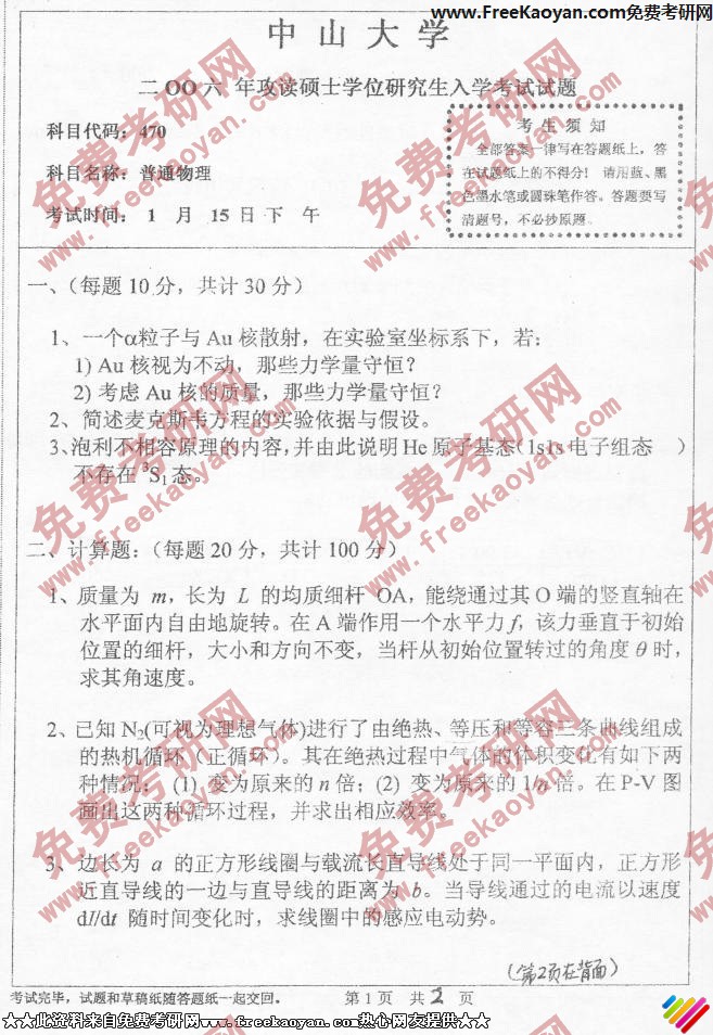 专业课考研经验 本站小编 FreeKaoyan 2018-01-22中山大学2006年考研真题-理论力学
