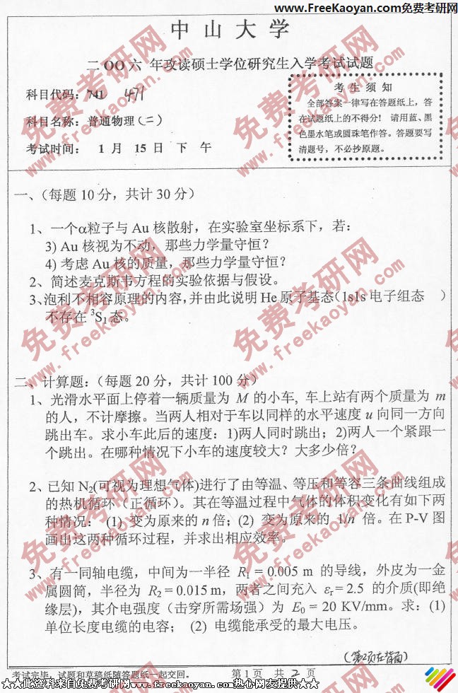 专业课考研经验 本站小编 FreeKaoyan 2018-01-22中山大学2006年考研真题-普通物理
