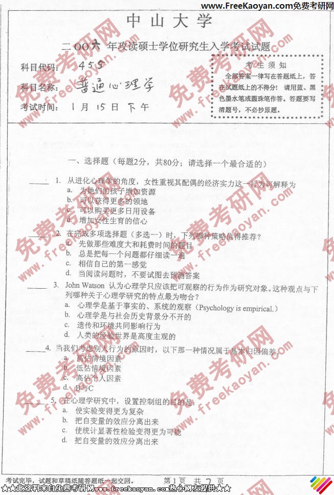 专业课考研经验 本站小编 FreeKaoyan 2018-01-22中山大学2006年考研真题-普通化学