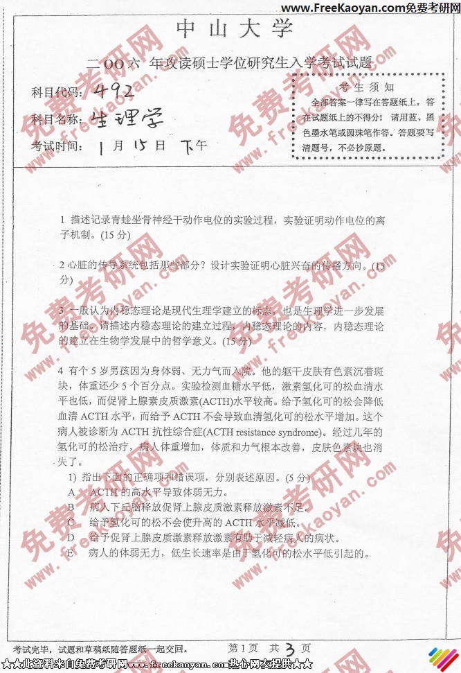 专业课考研经验 本站小编 FreeKaoyan 2018-01-22中山大学2006年考研真题-普通化学