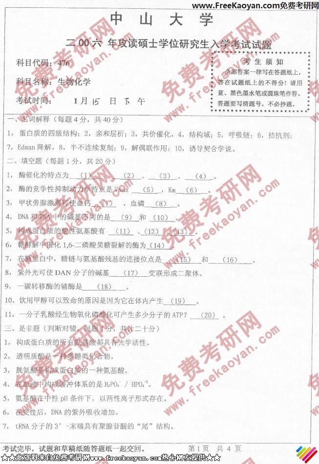专业课考研经验 本站小编 FreeKaoyan 2018-01-22中山大学2006年考研真题-普通生物化学
