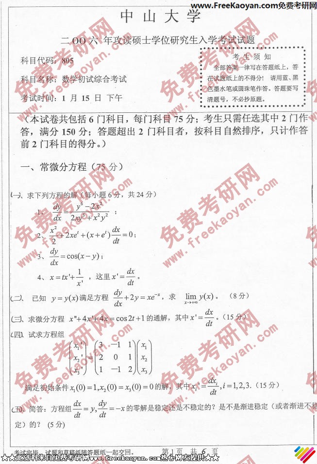 中山大学2006年考研真题-数学初试综合考试(六门任选两门)