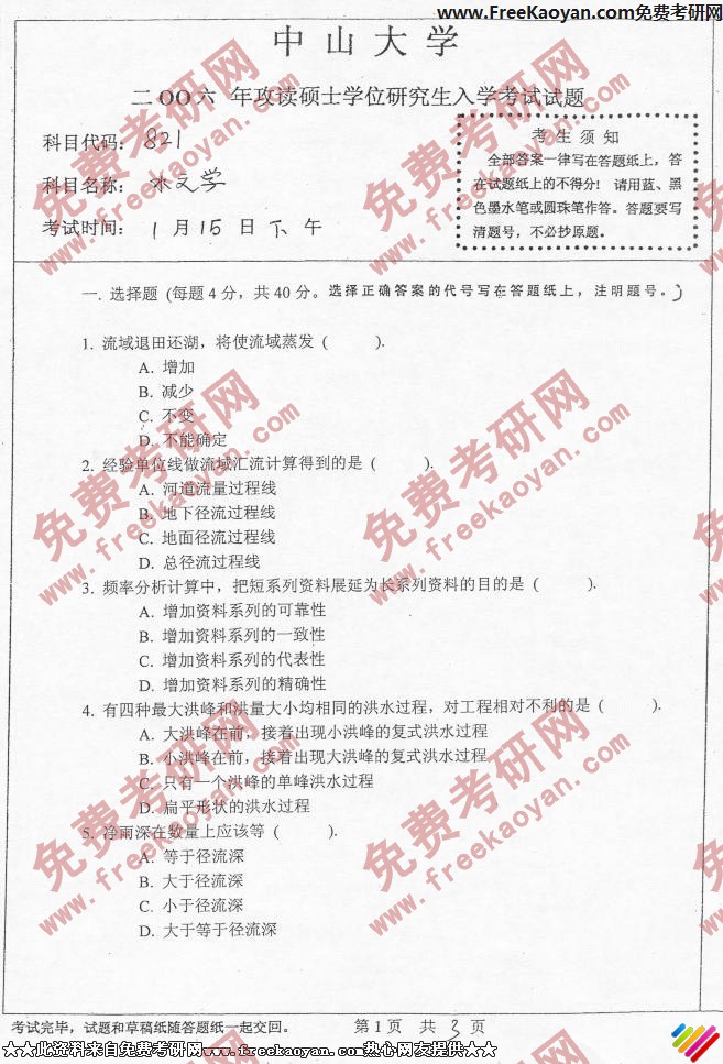 专业课考研经验 本站小编 FreeKaoyan 2018-01-22中山大学2006年考研真题-水力学