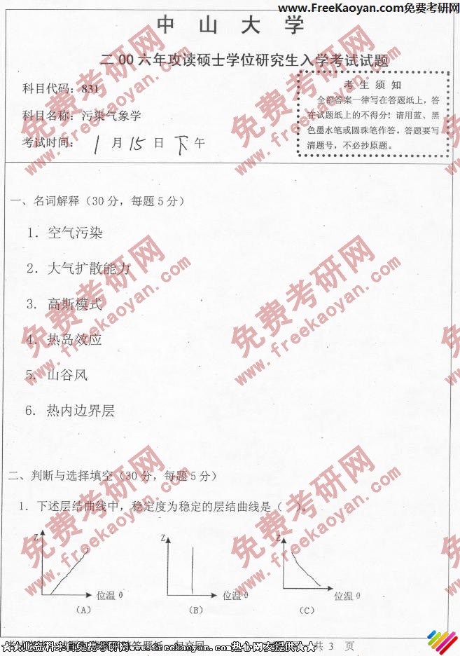 专业课考研经验 本站小编 FreeKaoyan 2018-01-22中山大学2006年考研真题-天气学与动力气象学
