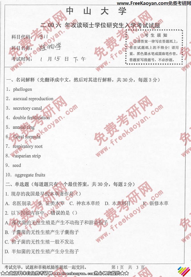 相关话题/中山大学 考研真题 植物学