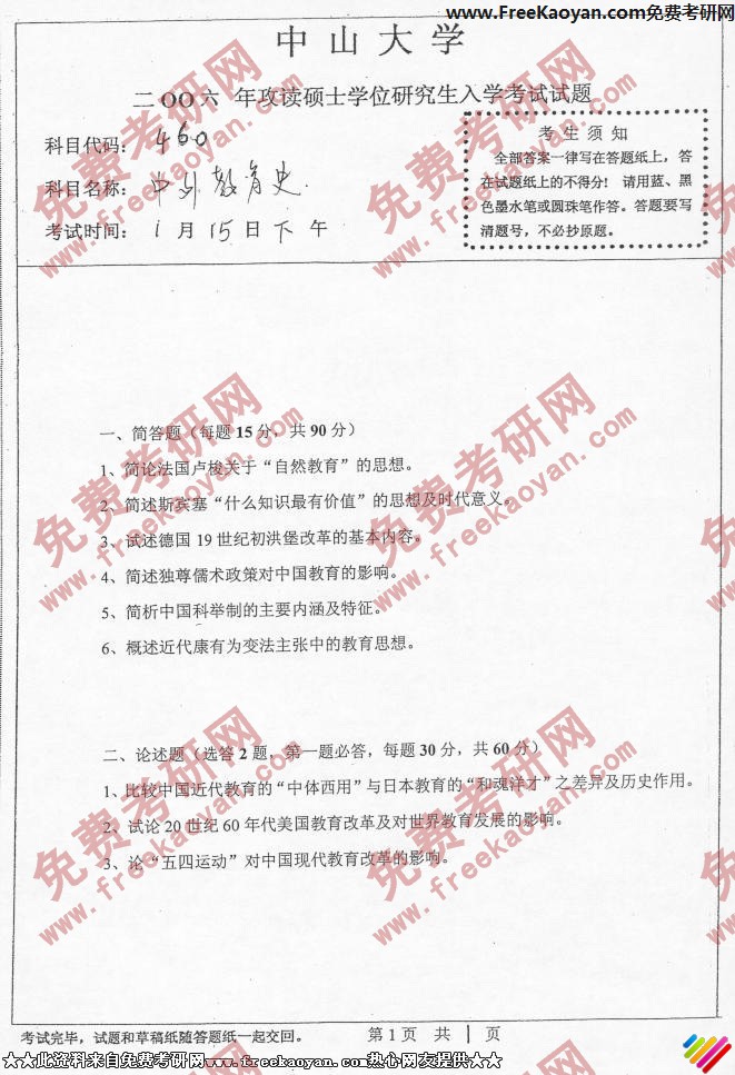 专业课考研经验 本站小编 FreeKaoyan 2018-01-22中山大学2006年考研真题-学校体育学