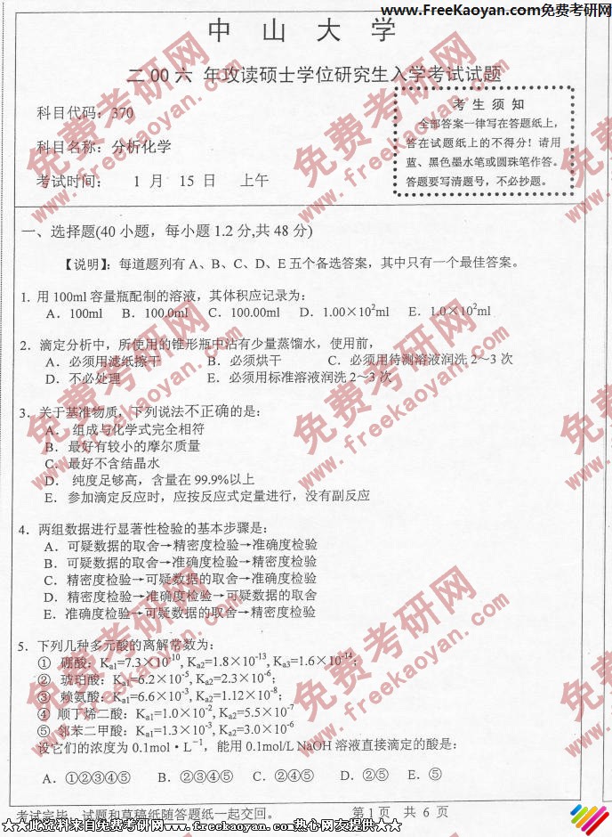中山大学2006年考研真题-分析化学