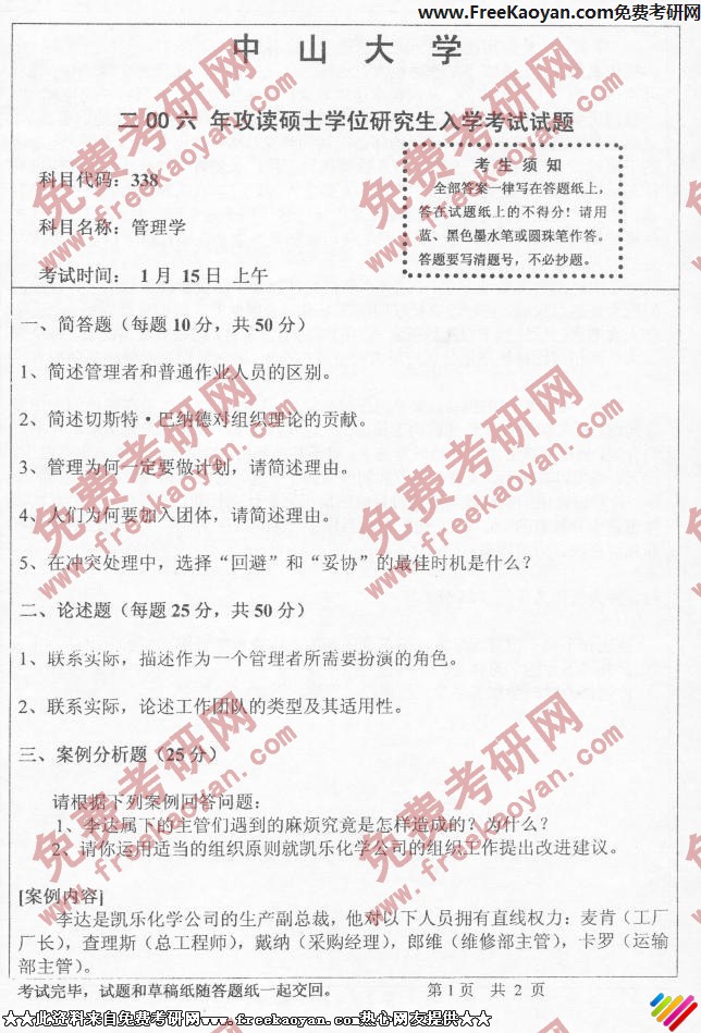 专业课考研经验 本站小编 FreeKaoyan 2018-01-22中山大学2006年考研真题-管理经济学与管理学
