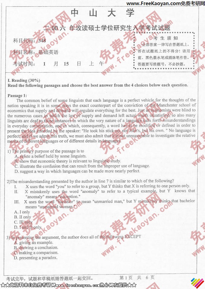 中山大学2006年考研真题-基础英语