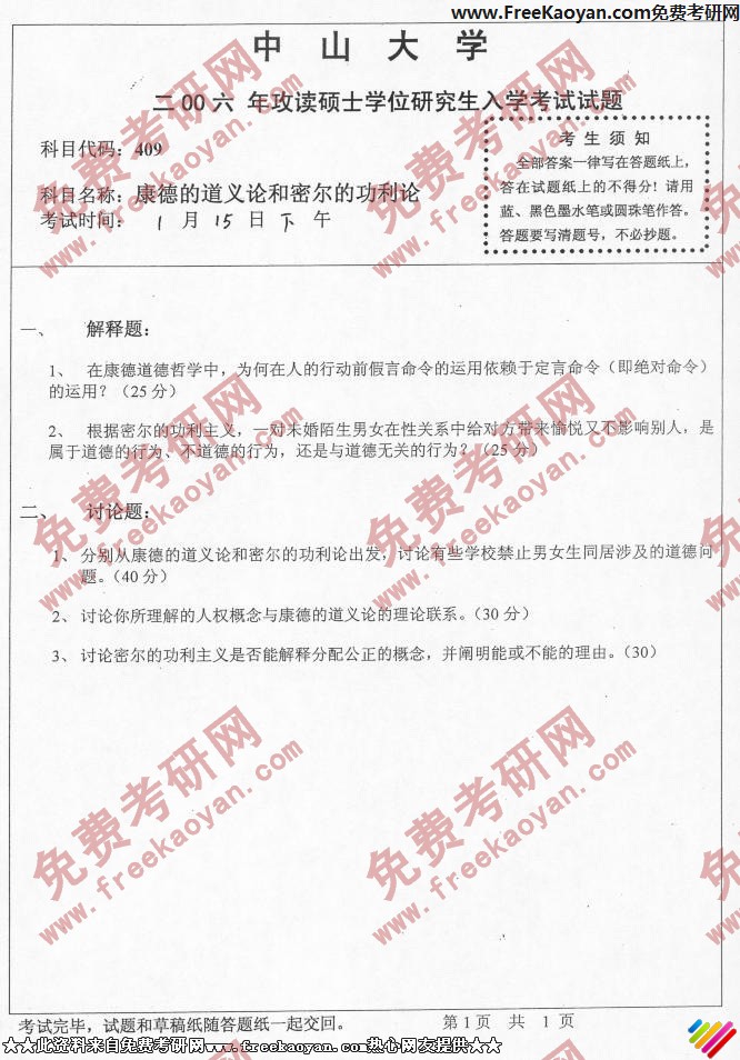 中山大学2006年考研真题-康德的道义论和密尔的功利论