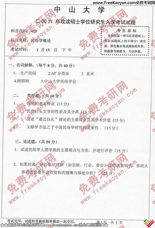 专业课考研经验 本站小编 FreeKaoyan 2018-01-22中山大学2006年考研真题-旅游管理
