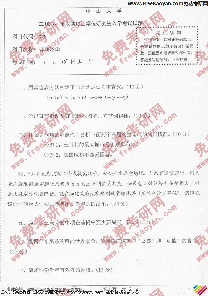 中山大学2006年考研真题-普通逻辑