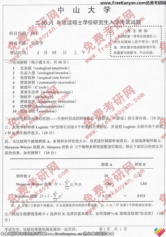 中山大学2006年考研真题-生态学