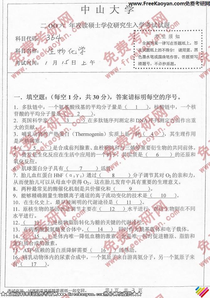 专业课考研经验 本站小编 FreeKaoyan 2018-01-22中山大学2006年考研真题-生物化学