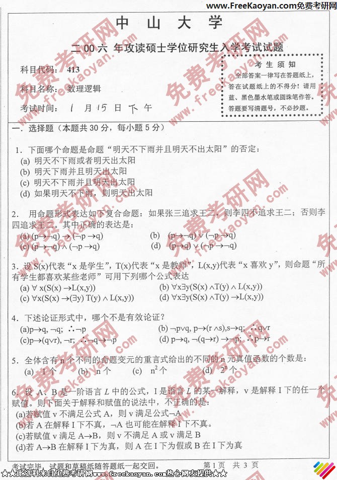 中山大学2006年考研真题-数理逻辑
