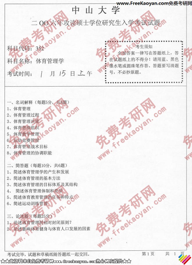 专业课考研经验 本站小编 FreeKaoyan 2018-01-22中山大学2006年考研真题-数学(单考)