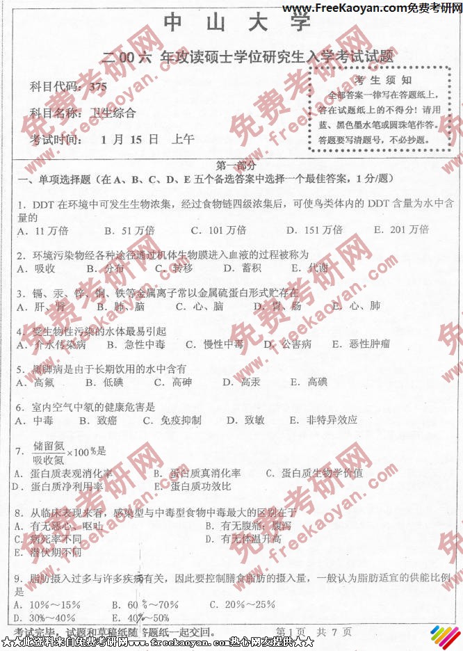 中山大学2006年考研真题-卫生综合