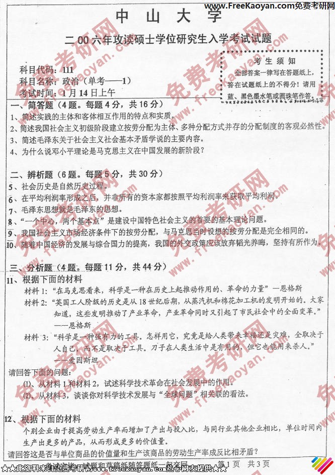 中山大学2006年考研真题-政治(单考)