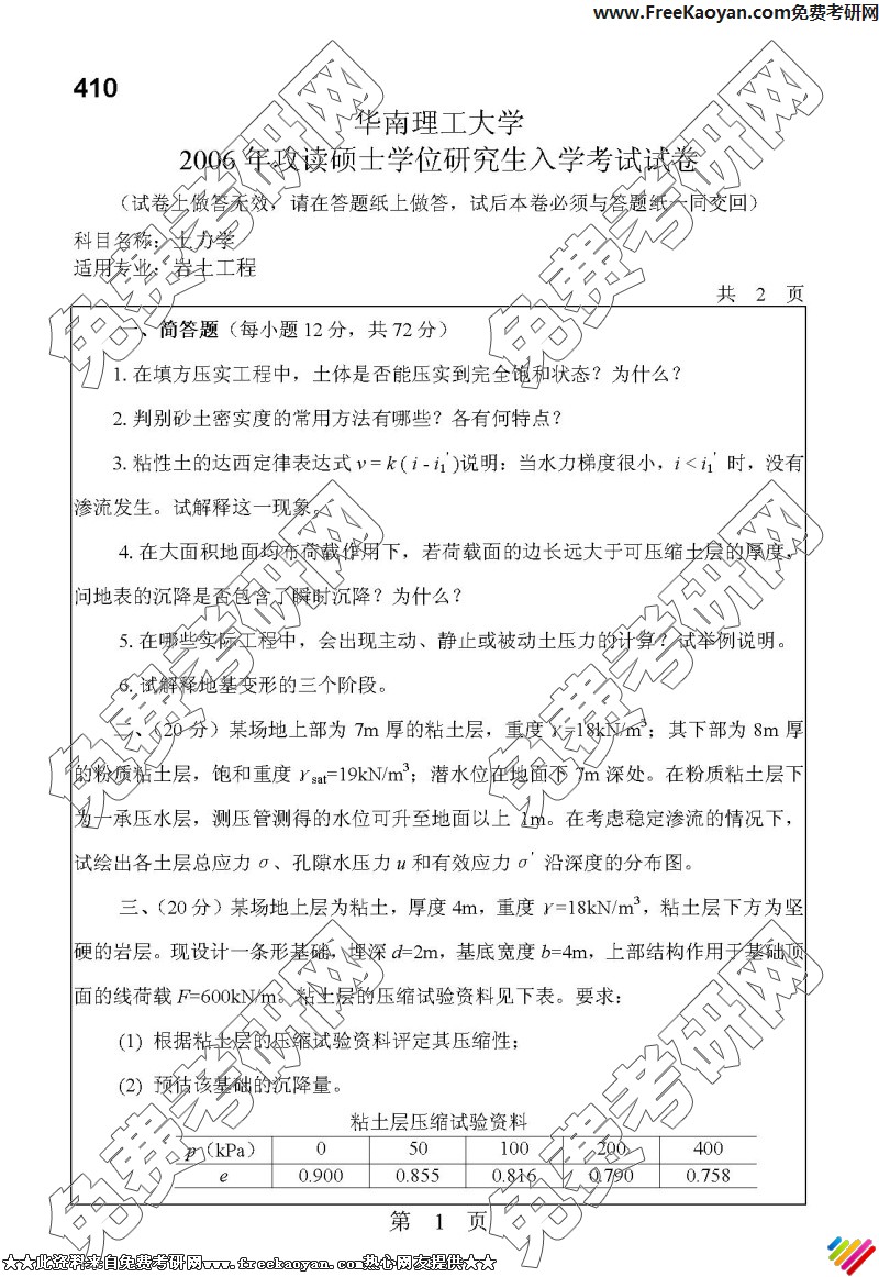 华南理工大学2006年考研真题-土力学