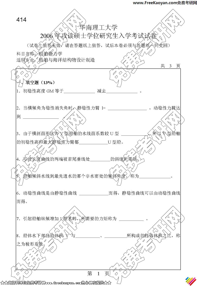 华南理工大学2006年考研真题-船舶静力学